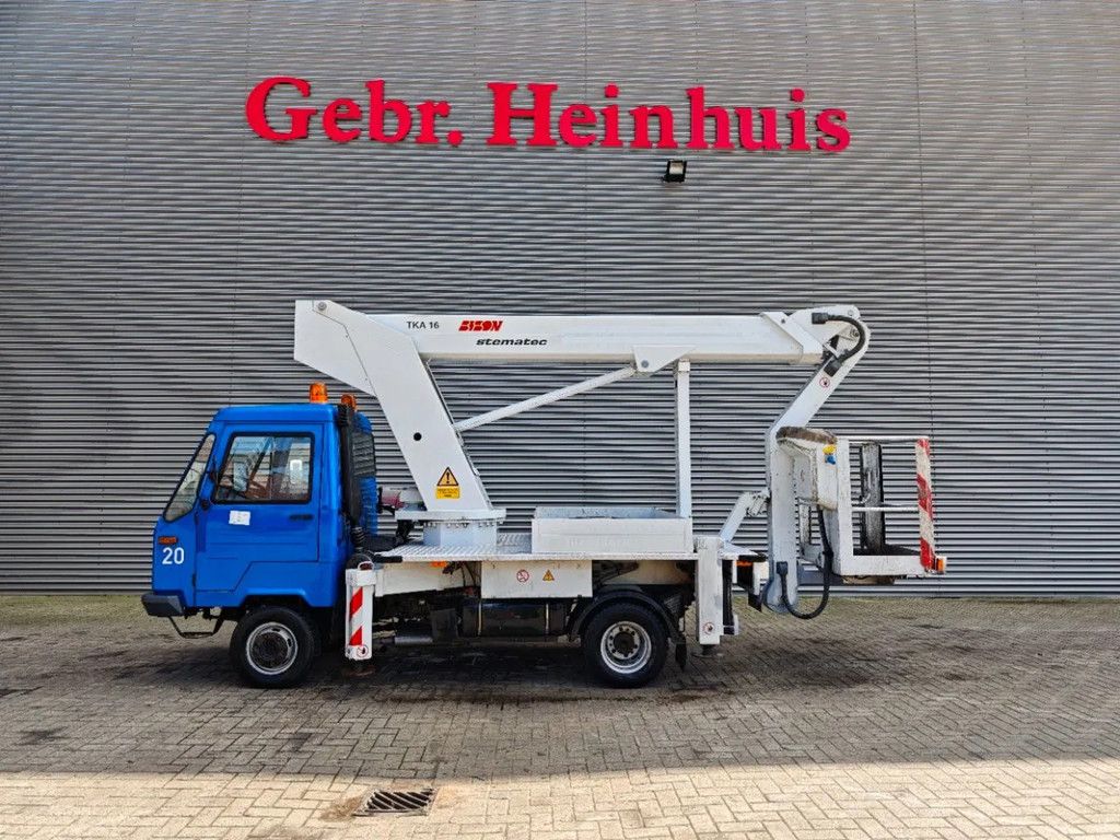 Year: 1999. Milage: 47.227 km. Manual gearbox 5 gears. Weight: 4120 kg. Max weight: 4800 kg. Axle load: 1: 1950 kg. 2: 3200 kg. 2 persons. Wheelbase: 2600 mm. Sparetyre. Tyres: 195R14 70%. Bison TKA 16. Year: 1999. Hours: 8083. Max working presure: 190 Bar. Max capacity basket: 200 kg / 2 persons + 40 kg. Max permitted tilt: 0 degree. 4 point outriggers. Rotated basket. Max wind speed: 12,5 m/s. Max lateral force: 300 N. Electrical function in basket. Max working height: 16 meter. German Car! ID NR: 677. The General Terms and Conditions of Heinhuis are applicable to all adverts, offers and quotations by Heinhuis, all agreements entered into by Heinhuis and the negotiations preceding them. By any form of response you accept the applicability of the General Terms and Conditions of Heinhuis and you declare that you have taken note of these General Terms and Conditions. Our prices are export netto prices. Für mehr Informationen: |