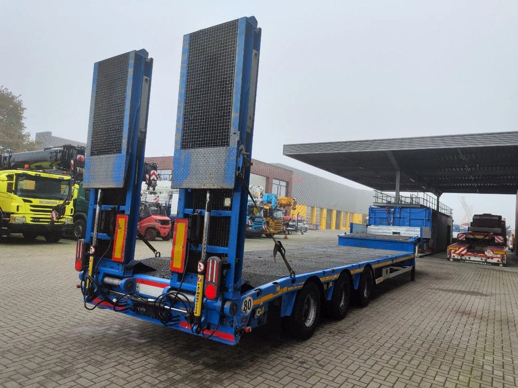 Year: 2016. 10 tons SAF axles. Weight: 12.600 kg. Load capacity: 29.400 kg. Max weight: 42.000 kg. Kingpin load: 18.000 kg. Hydraulic works on NATO. Allu boards on neck. Winch with Remote Control. Hydr. bridge from floor to neck. - Lenght: 3000 mm. Airsuspension. Slitted floor. Powersteering 3 steering axles. 2 point hydraulic outriggers on the back. 2 way hydraulic ramps: - lenght: 2850 + 1750 mm. - hydr. from left to right. Dimmensions: Neck: L: 3750 mm. W: 2500 mm. H: 1350 mm. Kingpin height: 1150 mm. Floor: L: 9600 mm. W: 2500 mm. H: 900 mm. Tyres: 235/75R17,5 80%. German Trailer! ID NR: 437. The General Terms and Conditions of Heinhuis are applicable to all adverts, offers and quotations by Heinhuis, all agreements entered into by Heinhuis and the negotiations preceding them. By any form of response you accept the applicability of the General Terms and Conditions of Heinhuis and you declare that you have taken note of these General Terms and Conditions. Our prices are export netto prices. Für mehr Informationen: |