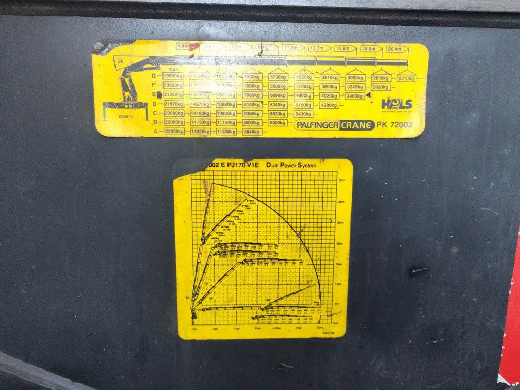 Year: 2008. Milage: 140.675 km. Manual gearbox 8 gears. Weight: 27.850 kg. Max weight: 41.000 kg. Axle load: 1: 9000 kg. 2: 9000 kg. 3: 13.000 kg. 4: 13.000 kg. Multifunctional steering wheel. Retader / Intarder. Airconditioning. Fridge. Webasto Nightheater. Sleeper cabin 1 bed. Digital tacho. Electrical operated windows and mirrors. Wheelbase: 1-2: 1750 mm. 1-3: 4700 mm. 1-4: 6050 mm. Radio CD. On the back airsuspension. Euro 5. Ringfeder trailer coupling. Hubreduction. Dimmensions detachable floor: L: 5000 mm. W: 2480 mm. H: 1500 mm. H Allu boards: 600 mm. 5th wheel height: 1450 mm. Tyres: Front: 385/65R22,5 60%. Rear: 315/80R22,5 60%. Palfinger PK 72002. Year: 2007. Hours: 10.429. 6 x Hydr. extandable. Jip 6 x Hydr. extandable. Winch. 6 point hydr. outriggers. Frontabstutzung. Radio Remote Control. ID NR: 201. The General Terms and Conditions of Heinhuis are applicable to all adverts, offers and quotations by Heinhuis, all agreements entered into by Heinhuis and the negotiations preceding them. By any form of response you accept the applicability of the General Terms and Conditions of Heinhuis and you declare that you have taken note of these General Terms and Conditions. Our prices are export netto prices. For more information: |