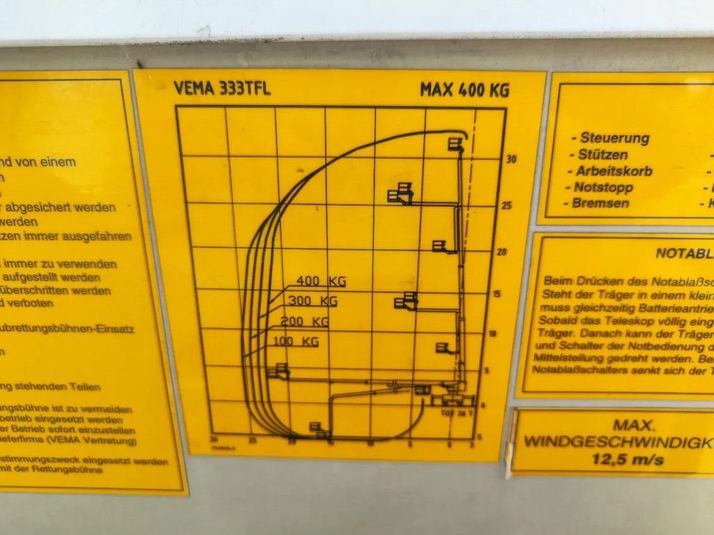Scania P124 420 6x2 Year: 2003. Milage: 32.993 km. Automatic. Max weight: 26.000 kg. Euro 3. 3 Persons. Electrical operated windows. Retarder. Airconditioning. Radio. Navigation. Wheelbase: 1-2: 4450 mm. 1-3: 5800 mm. Airsuspension back. 3th axle steering axle. Tyres: 315/70R22,5 80%. Vema 333 TFL-E. Year: 2003. Hours: 1837h Max capacity basket: 400 kg / 4 persons + 40 kg. Max lateral force: 400 N. Max wind speed: 12,5 m/s. Rotated basket. Max height: 33.3 meter. Max outreach: 25 meter. Abstutzung + Wasserwerfer. Cabin type: CP14 ID NR: 669. The General Terms and Conditions of Heinhuis are applicable to all adverts, offers and quotations by Heinhuis, all agreements entered into by Heinhuis and the negotiations preceding them. By any form of response you accept the applicability of the General Terms and Conditions of Heinhuis and you declare that you have taken note of these General Terms and Conditions. Our prices are export netto prices. For more information: |